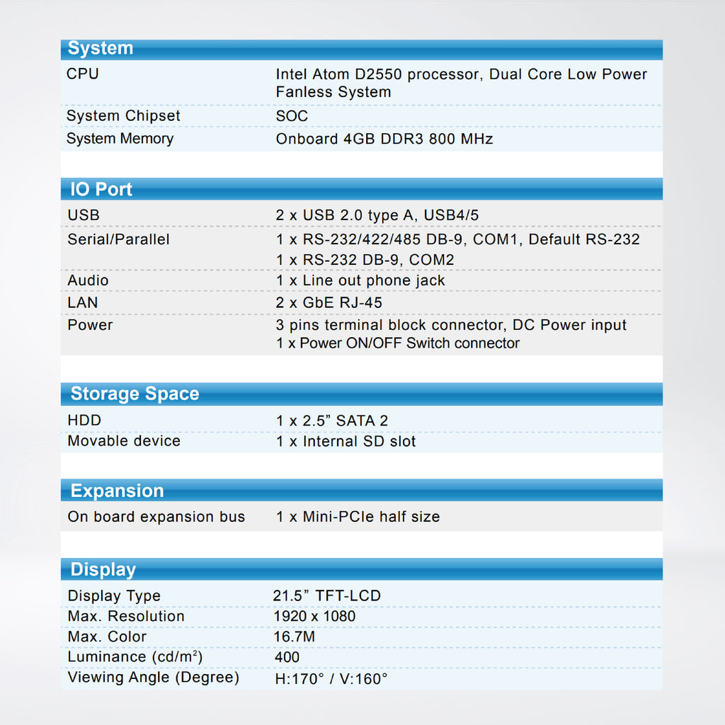 ARCHMI-721(P) HMI 21.5 Inch/1920x1080/D2550 1.86 GHz/4GB RAM/HDD 320GB/9–36V w/ADP