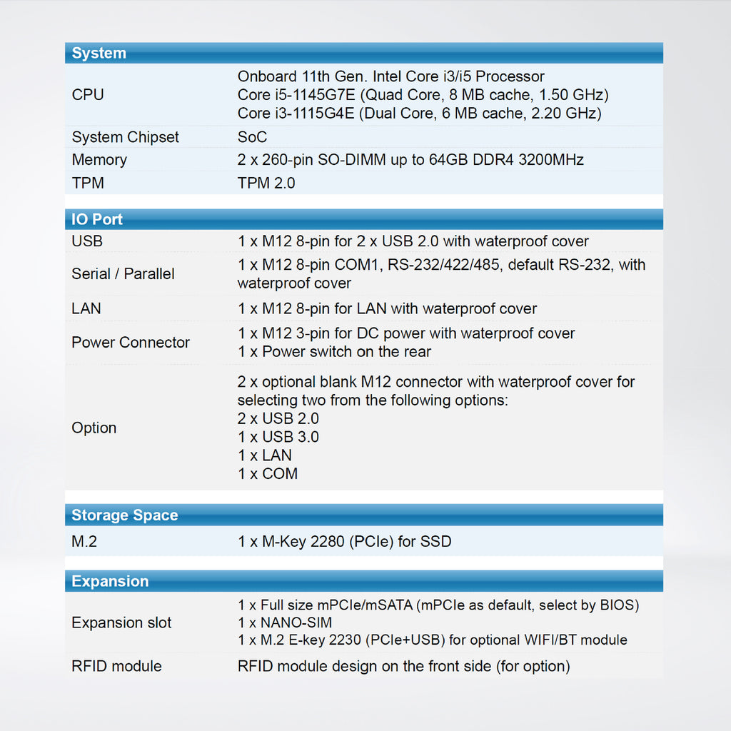 - USB 1 x M12 8-pin for 2 x USB 2.0 with waterproof cover
