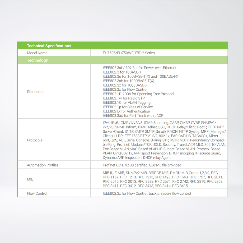 - ERPS Ring (recovery time < 20ms @ 40 switches), STP/RSTP for