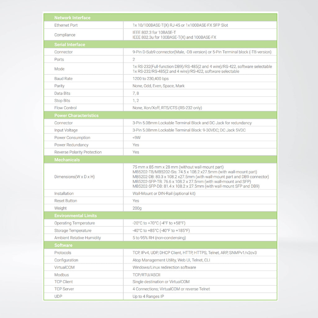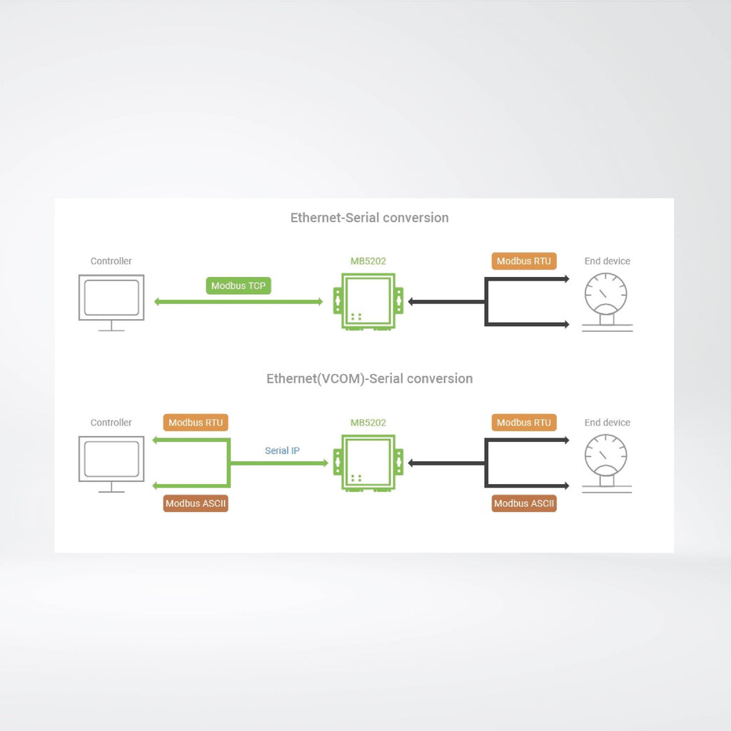 The MB5202 Modbus Gateway supports the four most commonly used communication standards, RS-232, RS-485, RS-422, and Ethernet. It comes with a user-friendly configuration utility to allow quick hardware interface selection, so you can easily connect to your existing communication infrastructure. And with industrial EMC protection plus a wide operation temperature range, MB5202 is ready for every mission.
