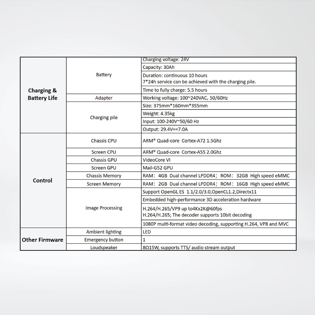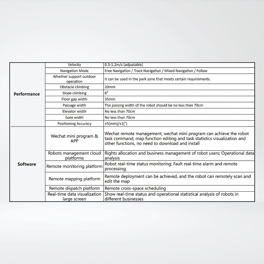Expandable Peripherals : Elevator, automatic door, notification lights and speakers, call buttons, follow bracelets, rollers, cabinets, shelves