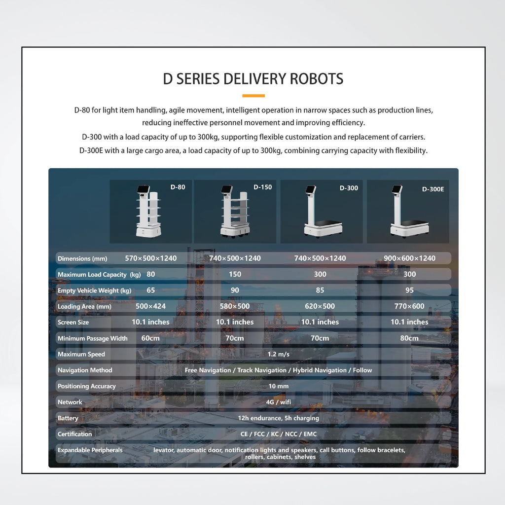 D-150 and D-300 with a load capacity of up to 300kg, supporting flexible customization and replacement of carriers.