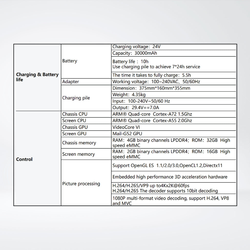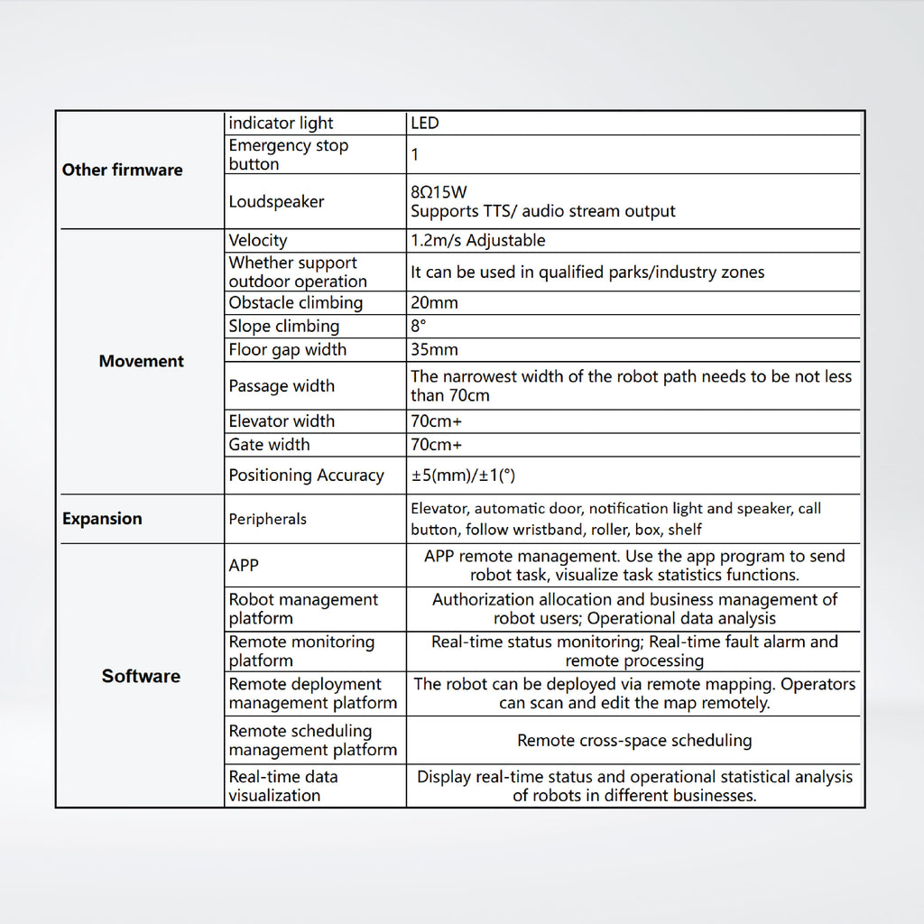 Expandable Peripherals : Elevator, automatic door, notification lights and speakers, call buttons, follow bracelets, rollers, cabinets, shelves