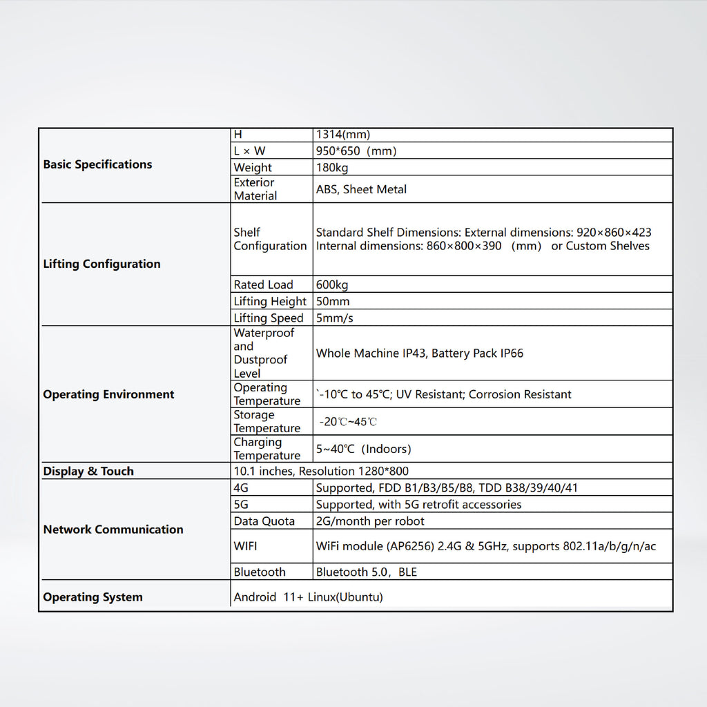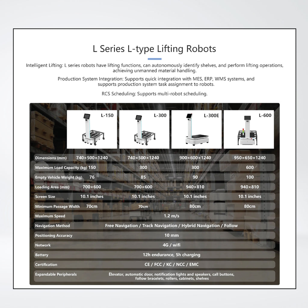 Intelligent Lifting: L series robots have lifting functions, can autonomously identify shelves, and perform