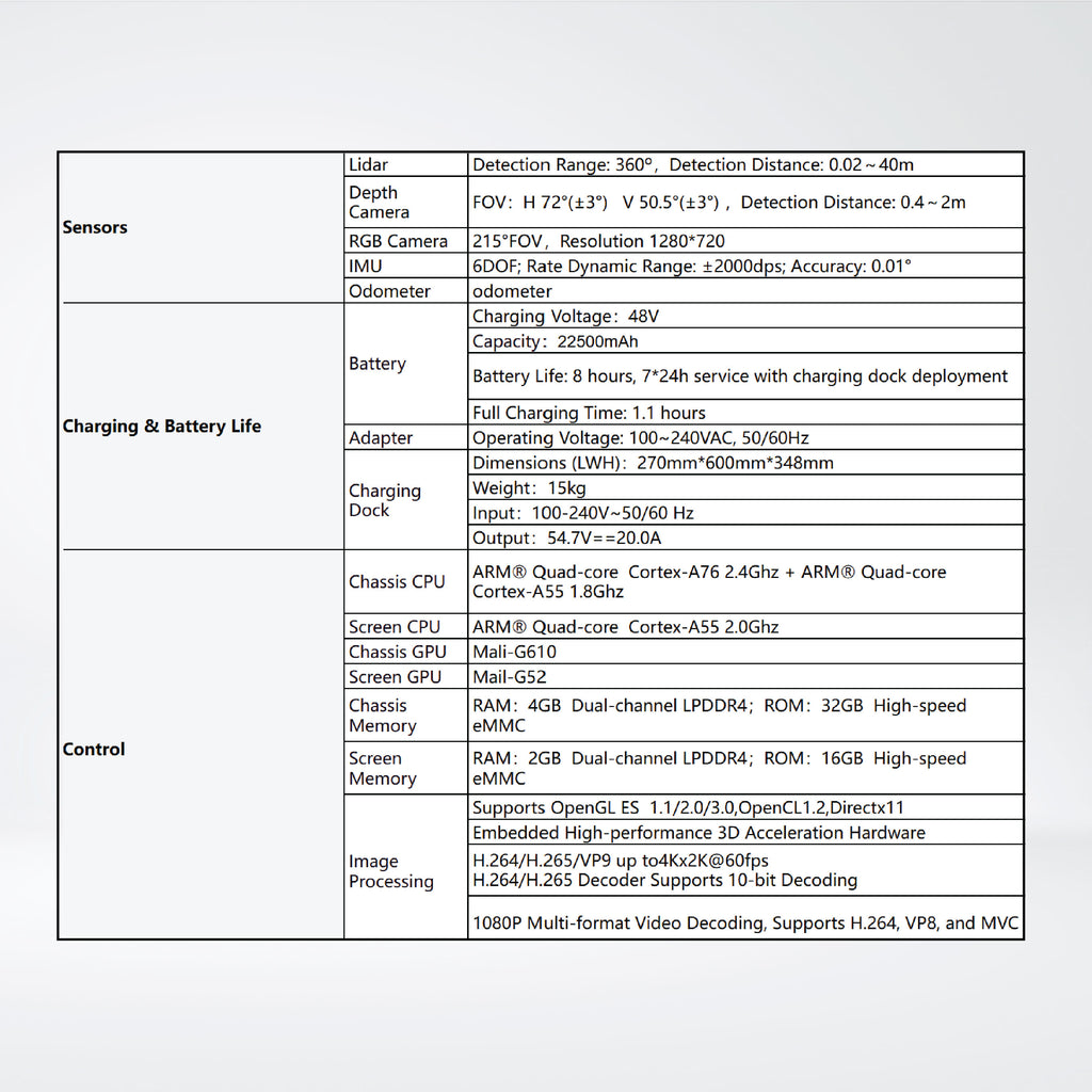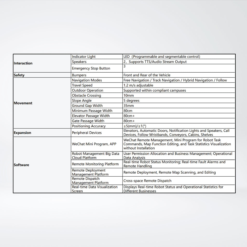 Expandable Peripherals : Elevator, automatic door, notification lights and speakers, call buttons, follow bracelets, rollers, cabinets, shelves