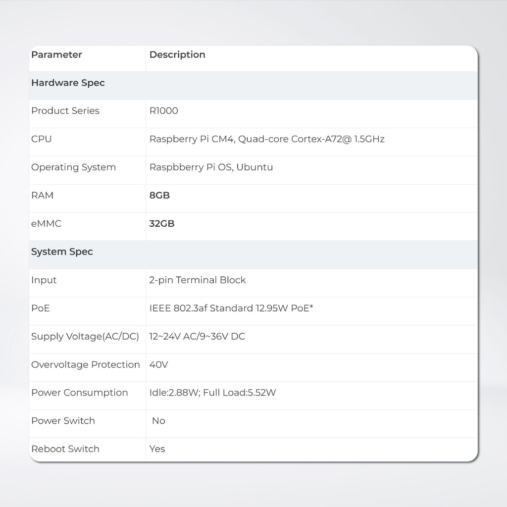 CPU : Raspberry Pi CM4, Quad-core Cortex-A72@ 1.5GHz