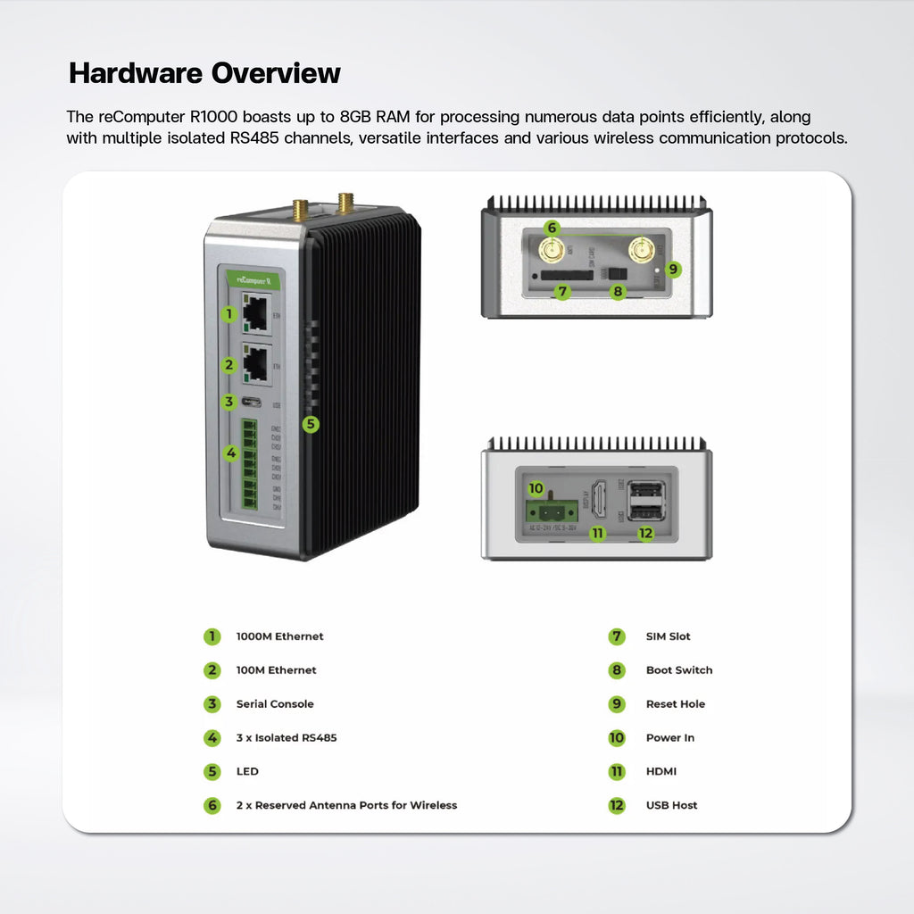 reComputer R1000 is a powerful and flexible industry Raspberry Pi IoT gateway & controller, CM4-powered, with AI capabilities. With 3*RS485, dual-ethernets, BACnet, and Modbus support, equipped with all the necessary features that a robust and reliable industrial edge IoT device needs. With compatibility with AI NPU accelerator, it's a perfect fit for remote access control, especially BMS, BAS, and iBMS.