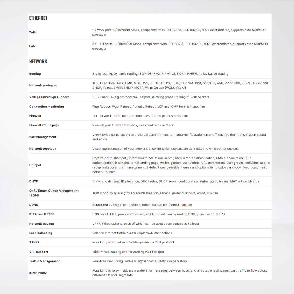 - Ethernet : 4 x 10/100/1000 Ethernet ports: 1 x WAN (configurable as LAN), 3 x LAN