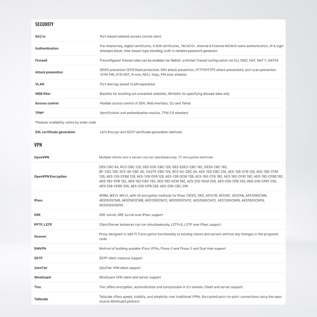 - Firewall : Port forward, Traffic rules, Custom rules, Pre-configured firewall rules, DMZ, NAT, NAT-T, NAT helpers, Unlimited firewall configuration via CLI