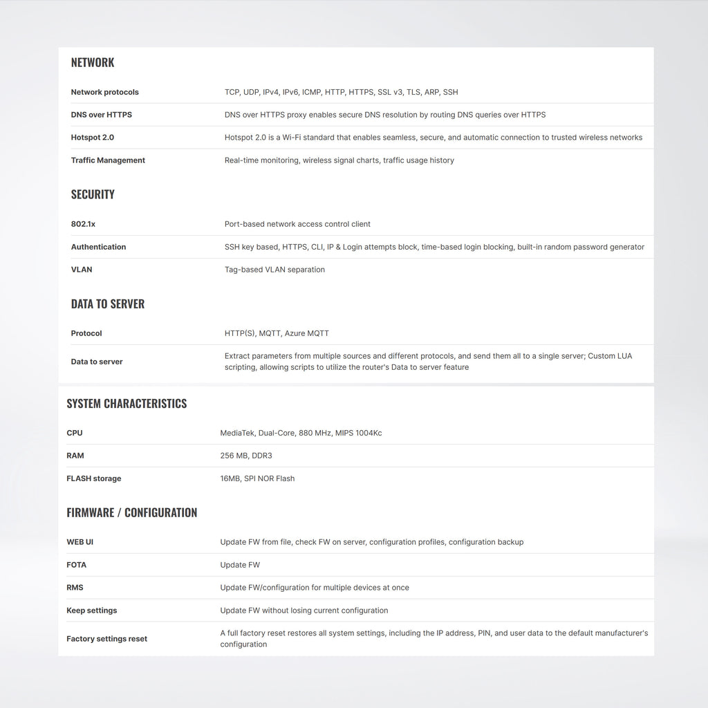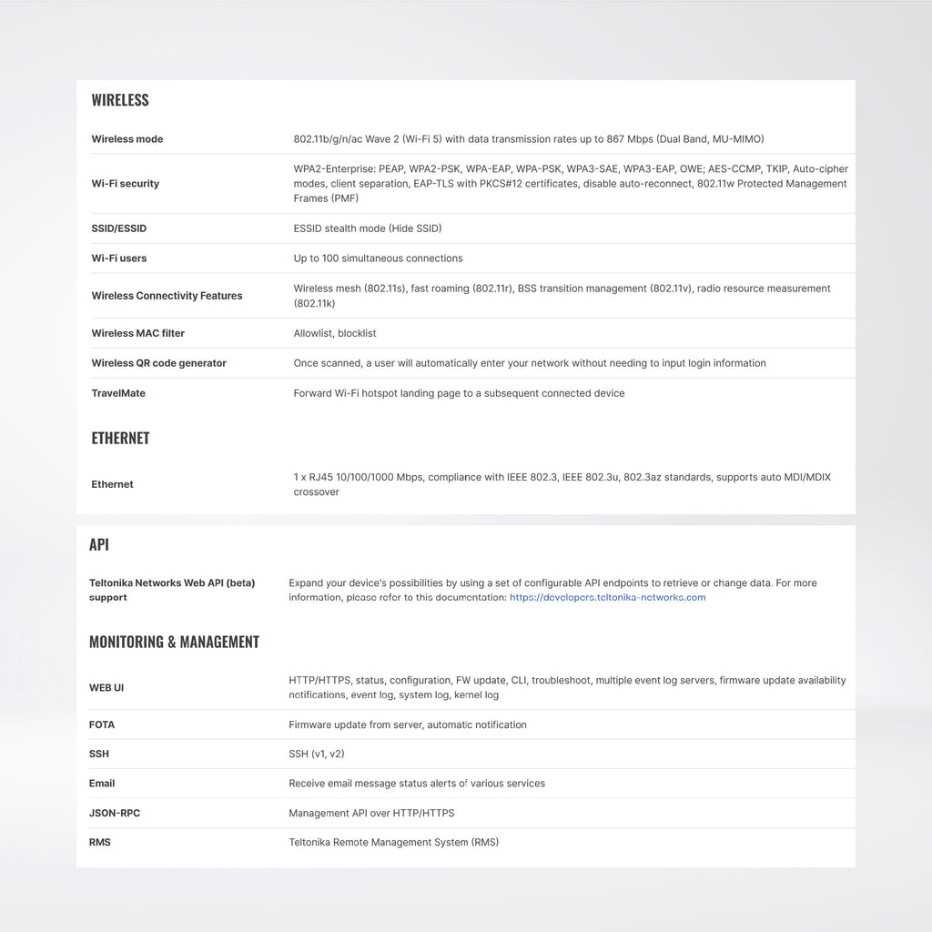 Wireless Connectivity Features : Wireless mesh (802.11s), fast roaming (802.11r), BSS transition management (802.11v), radio resource measurement (802.11k)